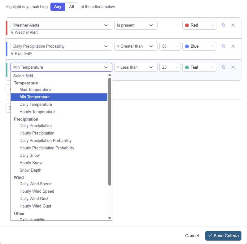 Customizable weather fields include parameters such as temperature, precipitation amounts, wind speeds, humidity, and severe risk levels.